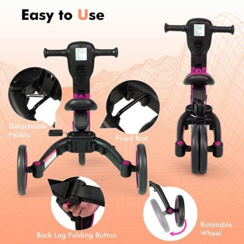 4-in-1 Kids Tricycle Foldable Toddler Balance Bike with Parent Push Handle Pink