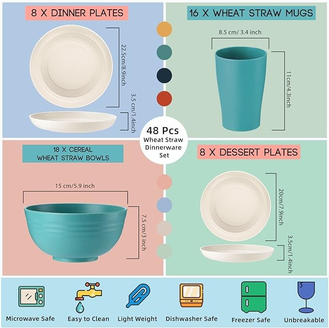 • Super Value Dinnerware Set: you will receive wheat straw dinnerware in 8 colors, including 8 pieces of dinner plates, 8 pieces of dessert plates, 16 pieces of soup bowls, 16 pieces of cups, a beautiful and stylish kitchen dinnerware set that can not only decorate your food, dining table and kitchen, but also bring appetite to you and your family