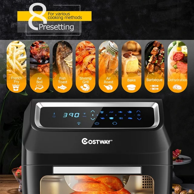 Feature Applies fast-heating and 360-degree hot air circulation technology for less fat and oil cooking Versatile air fryer, rotisserie, oven, and dehydrator functions The temperature range of 90-400 ℉ 60 minutes timer for cooking persistently and evenly 8 preset options make any kitchen task easy. Interior lighting and easy-view windows for easy check-in on your food Easy-to-use LED touch screen display Dishwasher-safe accessories for easy cleanup 6-Quart Large Capacity allows you to cook the perfect amount of food for 3–5 people. Footpads for stability and sound-reduce UL certified versatile air fryer oven Come with 6 dishwasher safe accessories