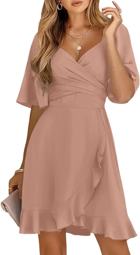 Dokotoo Women's Wrap V Neck Short Flared Sleeve Wedding Guest Dress Smocked Elastic Waist Tiered Belted Ruffle Hem Mini Dress