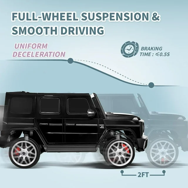 Joywhale 2-Seater Kids Ride on Licensed G63 has almost restored the real car's appearance, the luxurious and realistic appearance can give kids an excellent driving experience. And equipped with large 2-seater & powerful power configuration, which can provide strong power on various terrains for two kids. The 20" extended seat can give kids more comfortable driving experience. Kids also can enjoy a comfortable and smooth driving thanks to the four-wheel suspension and the soft braking system. The bumps on rough roads and the shock during braking can be significantly reduced. The seat belt and safety door lock can also protect little drivers' safety. Additionally, there is an emergency brake button on the remote control, which can stop the car immediately in case of an emergency. And it also provides various functions, Music/ FM Radio/ Bright Headlights/ Horn and more, kids can enjoy the fun of lights and music while driving. At the same time, it comes with a portable handle and folding wheels for easy carrying.