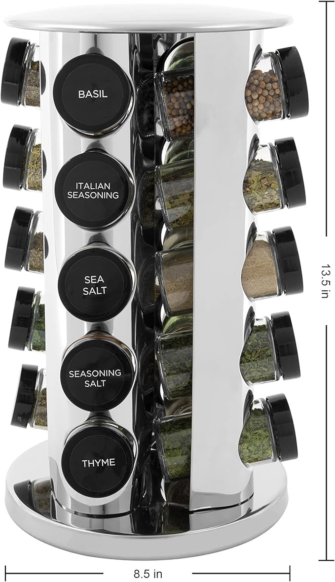 • STYLISH STORAGE: the rotating, polished stainless steel rack keeps spices neat and easily accessible on countertops or in cabinets