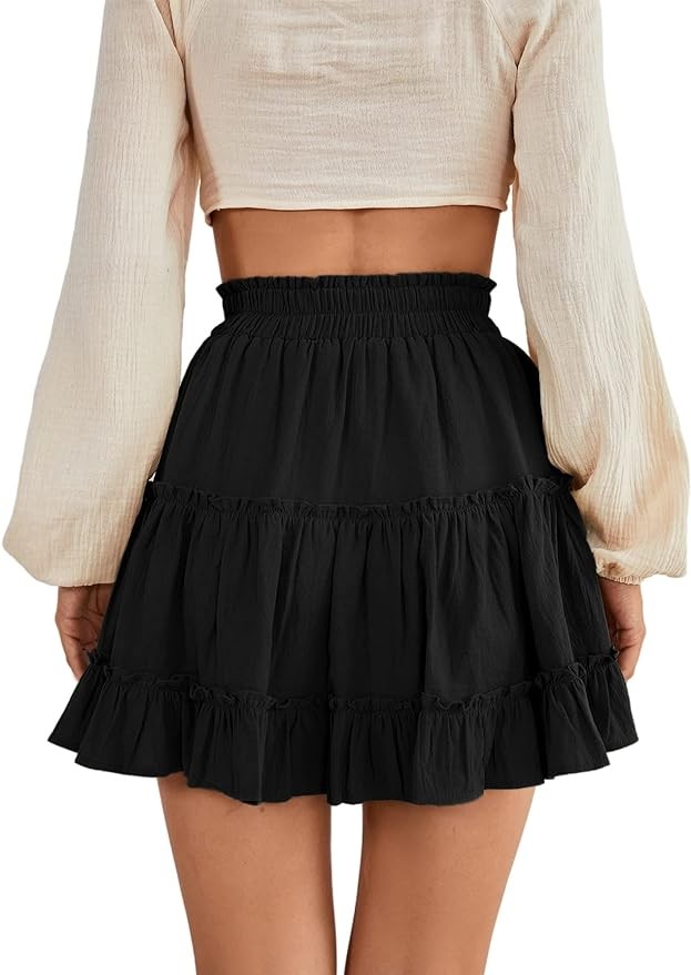 Solid color, smock elastic waist, pleated, layer ruffle hem, plain flowy short skirt for women and girls.