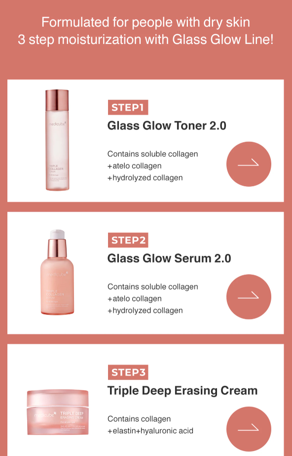 This set comes with our best selling, dual textured Zero Pore Pads, 1000x collagen infused Glass Glow Toner 2.0, Glass Glow Serum 2.0 and the crowd favorite, Triple Deep Erasing Cream!