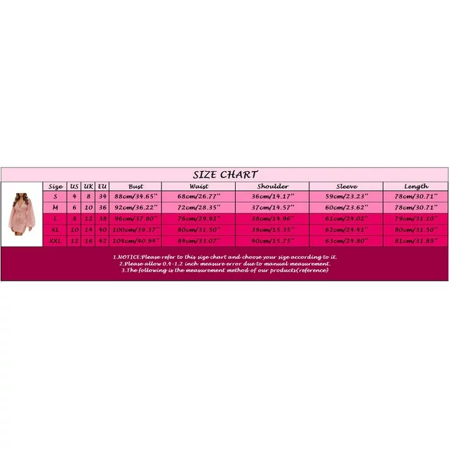 Size: XXL US: 12 UK: 16 EU: 42 Bust: 104cm/40.94'' Waist: 84cm/33.07'' Shoulder: 40cm/15.75'' Sleeve: 63cm/24.80'' Length: 81cm/31.89''