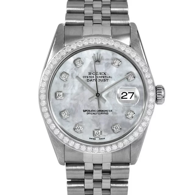 Pre-Owned Rolex 16014 Men's 36mm Datejust Wristwatch Mother of Pearl Diamond (3 Year Warranty)