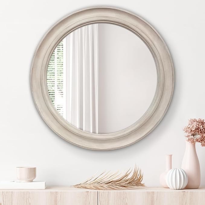 ★【It's In The Details】: Designed to tastefully add an accent of design anywhere in the home. This wall mounted mirror is crafted of no-distortion HD glass mirror and durable ABS composite frame, which is hand painted/brushed with weathered white finish to details.