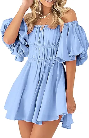 SHOWING OFF YOUR CHARMING: This Babydoll Dress Features Short Puffy Sleeves, A Line, Ruched Bust And Empire Waist. The Puffy Sleeve Dress Can Be Worn In Different Style, Pulled Down For A Sexy Off-Shoulder Look, Or Pulled On As A Casual Square Neck Dress. The Elastic Waist Dress With The Delicate Ruffles, Shows The Body Curves Well, And Makes The Short Dress Full Of Elegance And Femininity