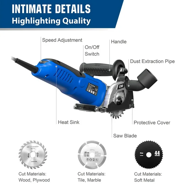 [Package Contents] -1 x Mini Circular Saw, 1 x 24T TCT Blade, 1 x 44T HSS Blade, 1 x Diamond Blade, 1 x Hex Wrench, 1 x Scale Ruler, 1 x Dust Exhaust Pipe, 1 x User Manual and a Storage Bag for easy carrying.