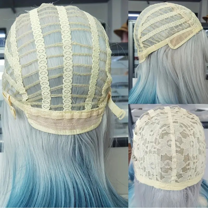 women synthetic wig long straight ombre two tone silvery grey blue hair for cosplay with bangs anime cosplay wig costume wig for halloween party details 5women synthetic wig long straight ombre two tone silvery grey blue hair for cosplay with bangs anime cosplay wig costume wig for halloween party details 5